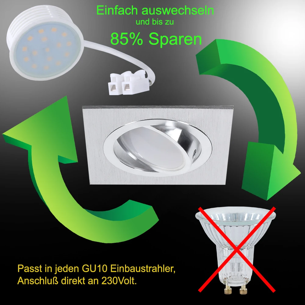 Ein zusätzlicher Dimmer wird nicht benötigt, denn Switchmo wird direkt mit dem LED-Leuchtmittel eingesetzt und kommt gänzlich ohne weitere Vorschaltgeräte oder Trafos aus. Sämtliche der in Verbindung mit Switchmo verbauten Leuchtmittel verfügen mit 5 Watt über eine äußerst geringe Leistungsaufnahme, sodass mehrere Einbaustrahler und Leuchten in einem Schaltkreis verbunden werden können.