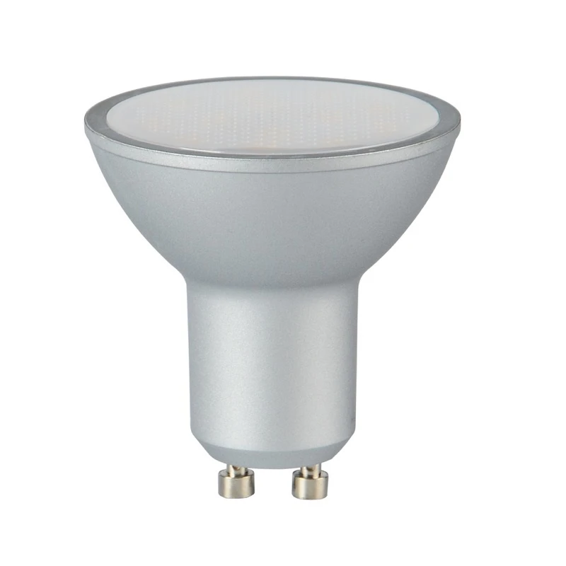 Dieses GU10 LED-Leuchtmittel in silber matt kann für einen sparsameren Stromverbrauch gegen jedes herkömmliche GU10 Halogenleuchtmittel ausgetauscht werden. Es hat hat einen Stromverbrauch von 5 Watt, das entspricht einer Helligkeit von 500 Lumen. Die Lichtfarbe ist angenehm warmweiß mit 3000 Kelvin und die Lebensdauer beträgt 15.000 Stunden.