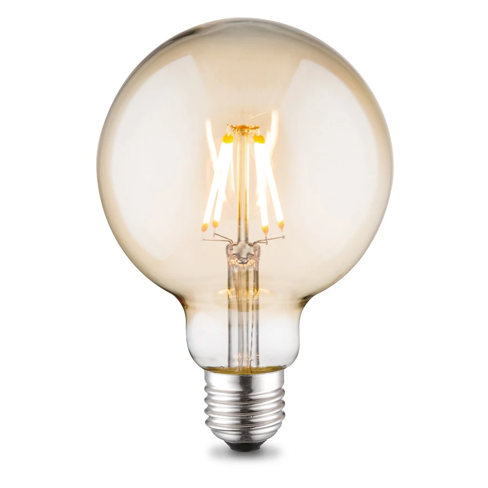 Setzen Sie mit dem eindrucksvollen Filament aus Amberglas einen hübschen Akzent in Ihrem Zuhause. Das LED-Leuchtmittel in Globe Form wird durch das ausgefallene Glühfaden Design abgerundet und lässt den beliebten Retro-Stil in Ihrem Wohnbereich einziehen. Die warmweiße Lichtfarbe sorgt zudem für eine gemütliche Wohlfühlatmosphäre. Das Leuchtmittel weist eine Leistung von 4 Watt auf und strahlt rund 346 Lumen aus. Ebenso das Dimmen des Leuchtmittels ist über einen separaten TronicDimmer möglich. Hierfür empfehlen wir Dimmer der Marken GIRA 30700, BERKER 2874 oder JUNG 225 TDE. Darüber hinaus ist es durch die verwendete LED-Technik sehr energiesparsam und überzeugt mit einer geringen Wärmeentwickelung. Das Filament hat einen Durchmesser von 9,5cm und eine Höhe von 13,5cm.