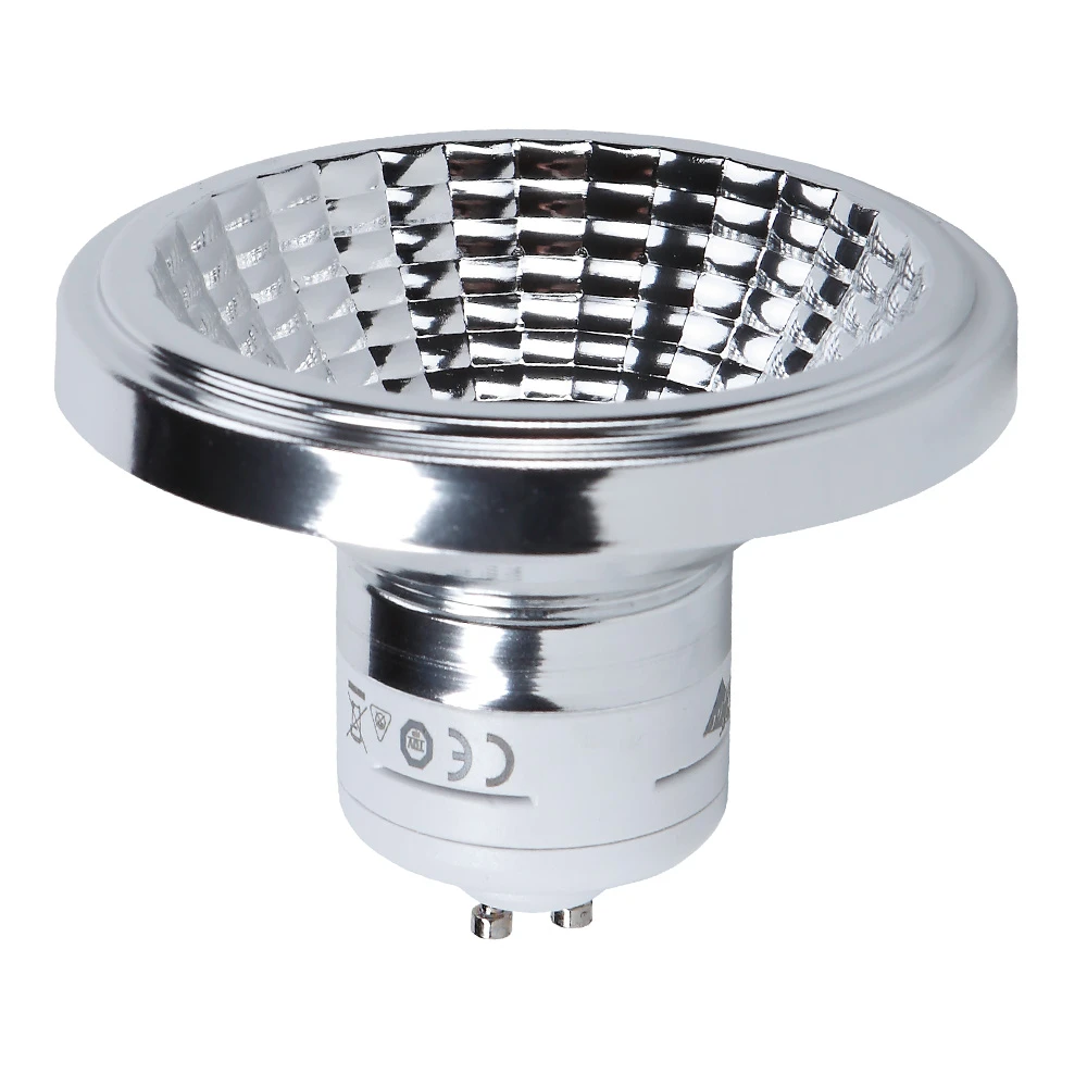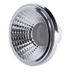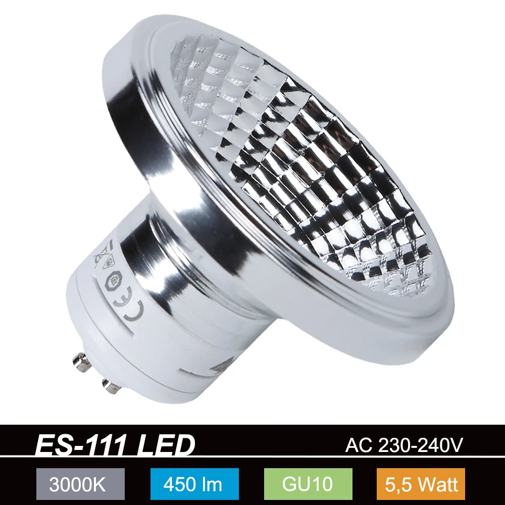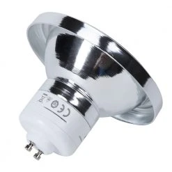 Der große Reflektor bewirkt ein gebündeltes Licht, es entsteht ein minimaler Stromverbrauch von 5,5 Watt bei einer Lichtausbeute von 450 Lumen. Das effiziente LED Leuchtmittel ist mit Bajonettsockel in ES111 Bauform.